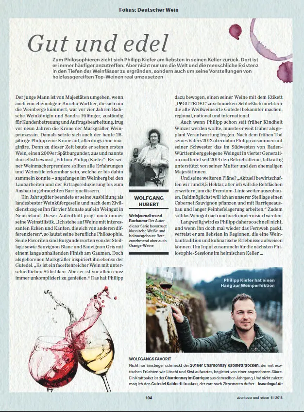 ABENTEUER UND REISEN – ist Deutschlands bekanntestes Reisemagazin und bietet seinen Lesern viele spannende Reportagen über die schönsten Destination und Orte, die besucht werden müssen – wie z.B. das Weingut Kiefer-Seufert in Ballrechten-Dottingen.