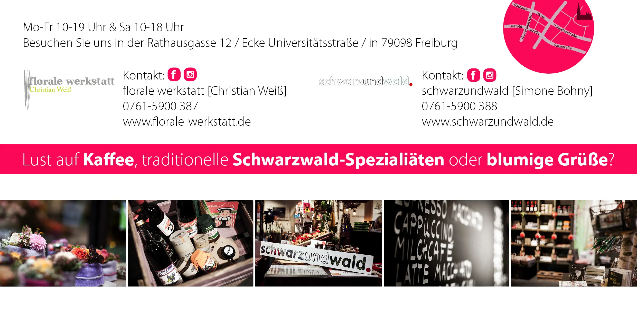 In 2019 feiern die „florale werkstatt“ & „schwarzwald“ in der Rathausgasse in Freiburg 10jähriges Jubiläum. Aus diesem Anlass wurde der Flyer noch einmal komplett überarbeitet und erneuert. Das Ergebnis kann sich auf jeden Fall sehen lassen – und versprüht noch mehr Lebensfreude.