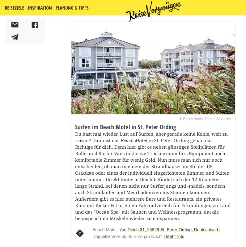 Während meiner Reise durch den Norden – konnte ich bereits zwei Mal das Beach Motel in St. Peter Ording „live“ erleben. Es ist ein toller Rückzugsort – direkt am Deich und mit Blick auf die Nordsee. Cooler Service & entspanntes Da-sein garantiert!