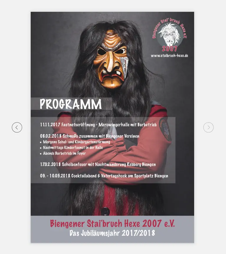Zeitlich passend zur neuen Saison 2017/2018 hat sich Daniel Slusarcik Photography der Poster, Flyer- und Visitenkarten Gestaltung der Biengener Stai’bruch Hexe 2017 e.V. angenommen. Für die richtige Werbung wurde eine DIN A3 Flyer erstellt auf dem auf die wichtigsten Veranstaltungen aufmerksam gemacht werden soll.