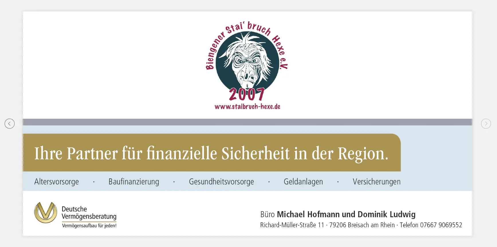 Zeitlich passend zur neuen Saison 2017/2018 hat sich Daniel Slusarcik Photography der Poster, Flyer- und Visitenkarten Gestaltung der Biengener Stai’bruch Hexe 2017 e.V. angenommen. Für die richtige Werbung wurde eine DIN lang Flyer erstellt auf dem auf die wichtigsten Veranstaltungen aufmerksam gemacht werden soll. Zudem wurde auf der Rückseite eine zusätzliche Anzeige vom Sponsor – Büro für Deutsche Vermögensberatung Michael Hofmann und Dominik Ludwig – platziert.